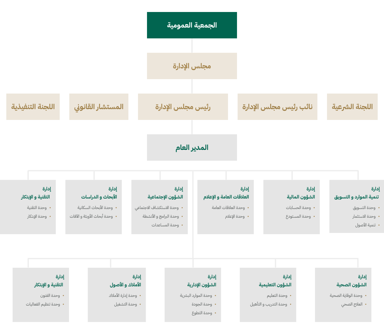 يمثل الهيكل التنظيمي الإطار الذي تُدار من خلاله أعمال الجمعية، ويوضح مستويات المسؤوليات وتوزيع المهام لضمان كفاءة الأداء وتحقيق الأهداف بوضوح وفعالية.